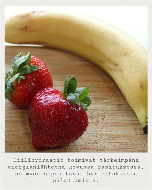 Energiaa sisältävät ravintoaineet ovat hiilihydraatit, proteiinit ja rasvat. Hiilihydraatit toimivat elimistössämme paitsi tärkeimpänä energianlähteenä kovassa rasituksessa, ne myös nopeuttavat harjoituksista palautumista. Lisäksi verensokeri eli glukoosi toimii hermoston tärkeimpänä energianlähteenä. Niukka hiilihydraattien saanti vaikuttaa negatiivisesti suorituskykyyn ja palautumiseen, sekä edistää lihasproteiinin käyttöä energiaksi.