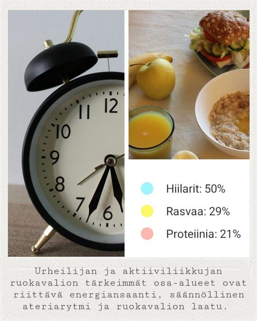 Urheilijan ja aktiiviliikkujan ruokavalion tärkeimmät osa-alueet ovat riittävä energiansaanti, säännöllinen ateriarytmi ja ruokavalion laatu.