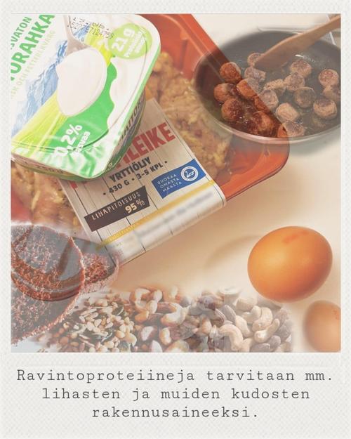 - Proteiinit 10-20% (1,4–2 g/kg/vrk). Lähteet: esim. liha, kala, maitotuotteet, kananmunat, täysjyvävilja ja palkokasvit.