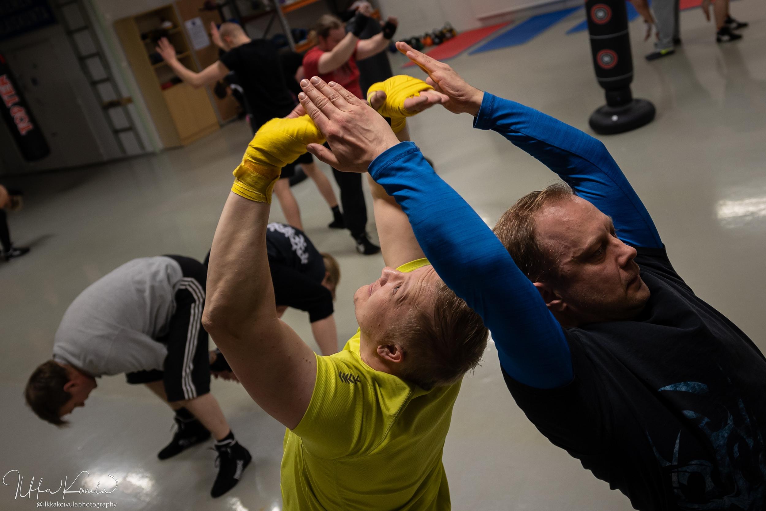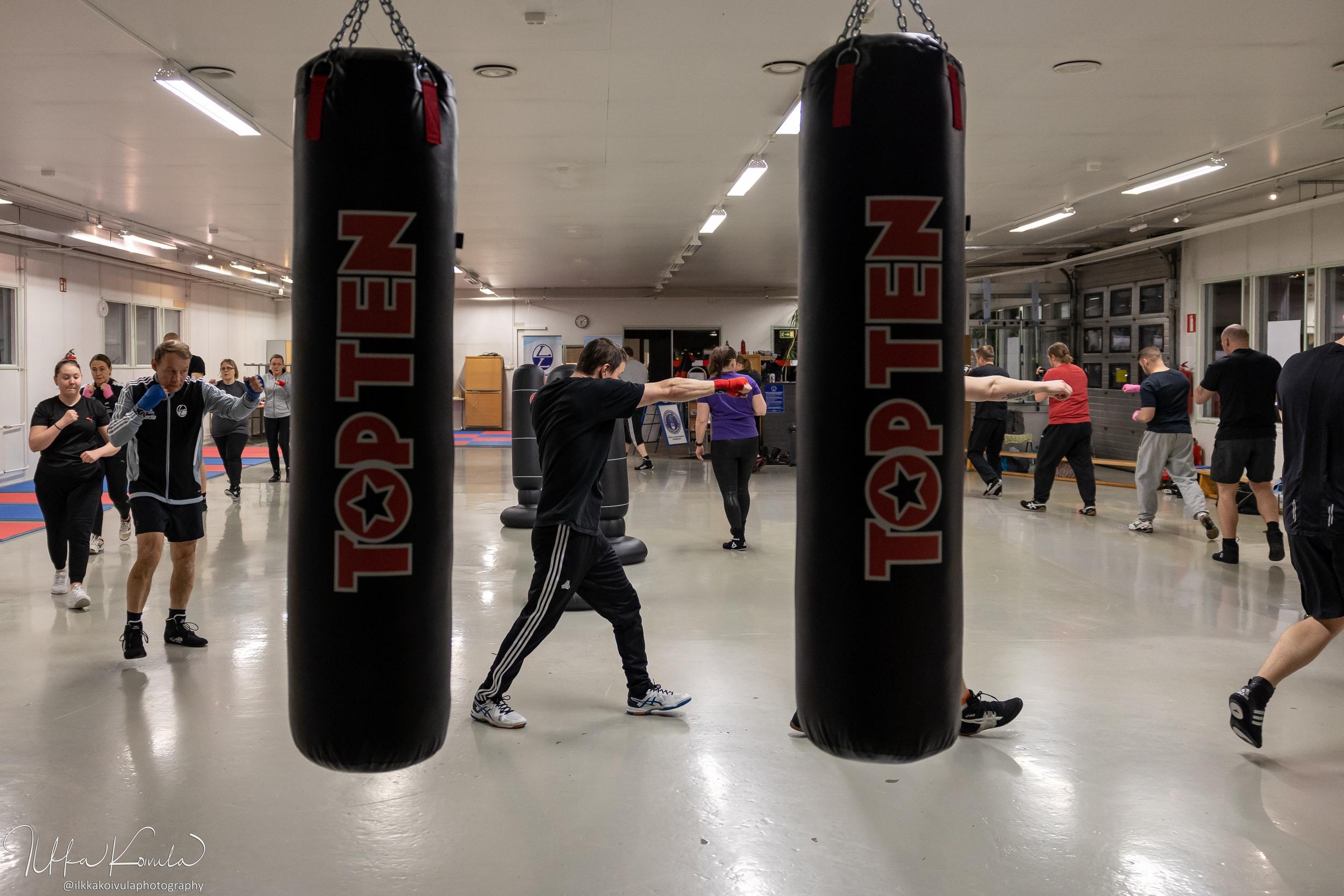 Kuvissa alla harrastajiamme aikuisten kuntonyrkkeilyryhmästä viime talven väistötiloista Alakorkalontieltä.
