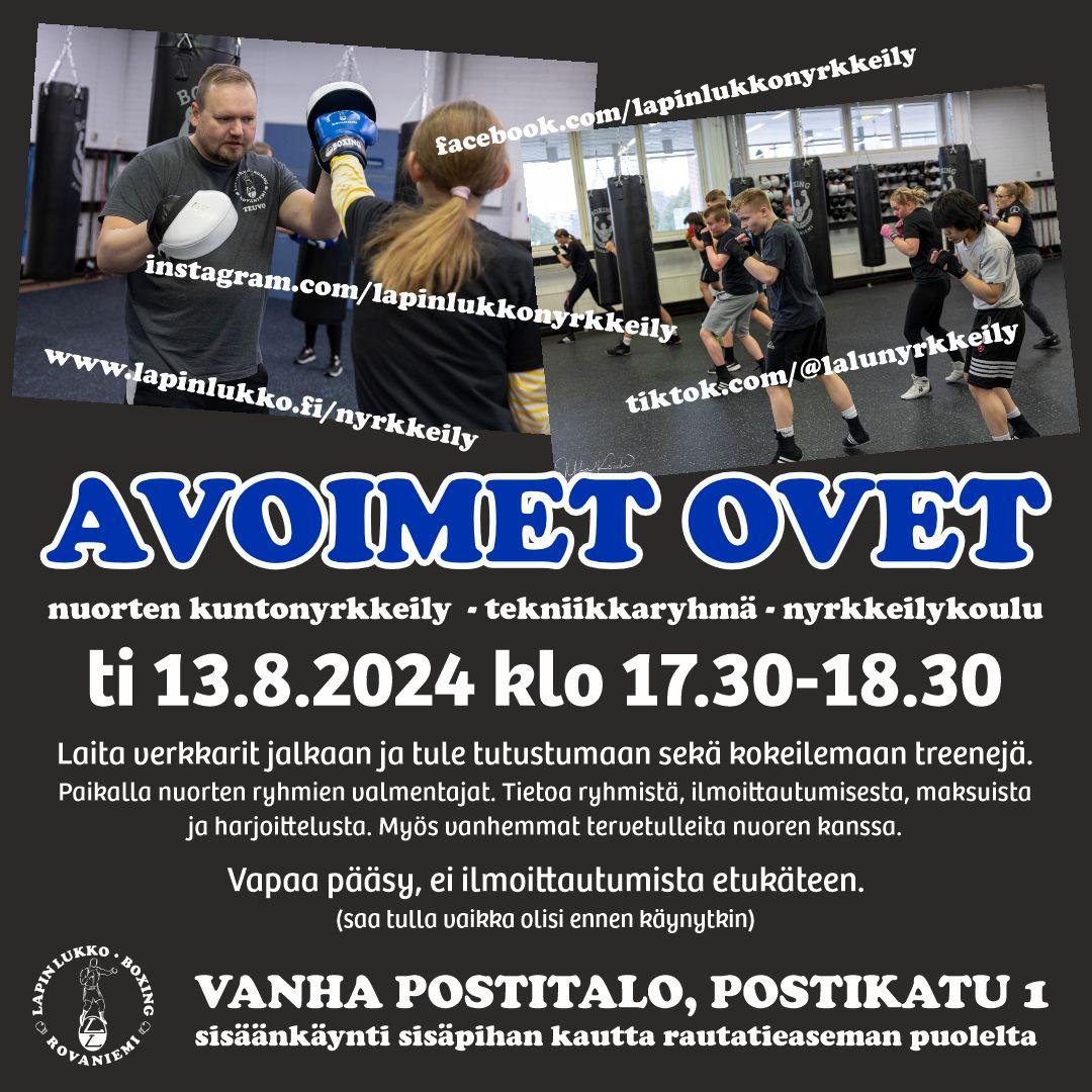 Lapin Lukko nyrkkeily järjestää nuorille nyrkkeilystä kiinnostuineille avoimet ovet 13.8. klo 17.30-18.30 Postikadun nyrkkeilysalilla.