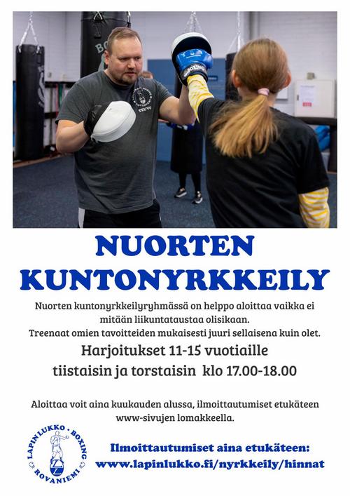 Nuorten kuntonyrkkeily jatkuu kevätkaudella yhdellä ryhmällä 16.1. alkaen. Nuorten kuntonyrkkeilyyn ovat tervetulleita kaikki 11-15 vuotiaat liikkumisesta, nyrkkeilystä ja kunnon kohottamisesta kiinnostuneet nuoret juuri sellaisena kuin olet. Aikaisempaa lajikokemusta ei tarvita. Nuorten kuntonyrkkeilystä vastaa Teuvo Kokkonen.