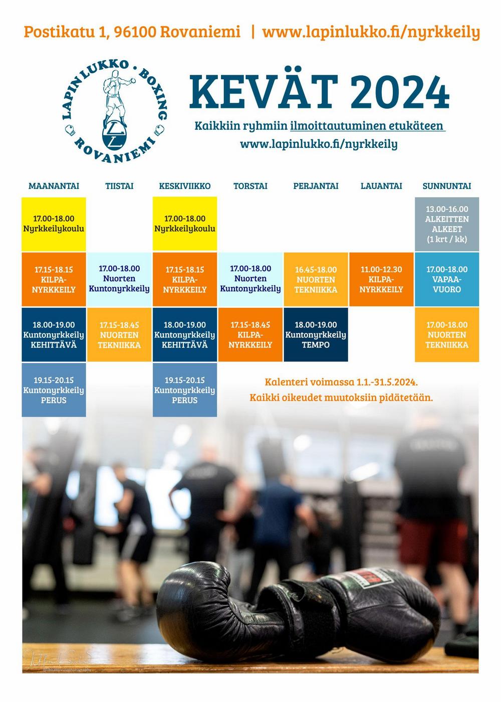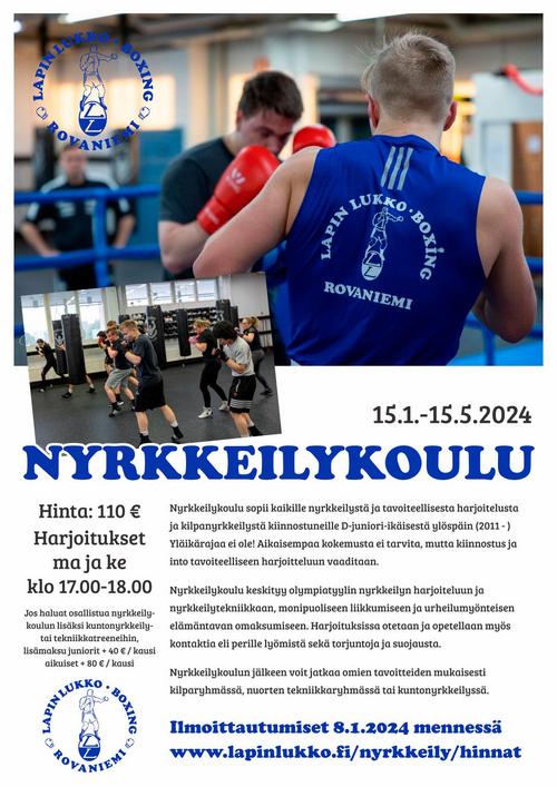 Uutena alkaa 15.1. NYRKKEILYKOULU, joka sopii jokaiselle tavoitteellisesti treenaavalle, nyrkkeilystä innostuneelle. Nyrkkeilykoulu on myös hyvä reitti kilpakehiin. Nyrkkeilykoulu kestää koko kevään, harjoitukset kaksi kertaa viikossa maanantaisin ja keskiviikkoisin. Nyrkkeilykoulun jälkeen voi siirtyä kilparyhmään, nuorten tekniikkaryhmään tai kuntonyrkkeilyyn, riippuen omista tavoitteistasi. Nyrkkeilykoulu lähtee liikkeelle ihan nyrkkeilyn perusteista joten aikaisempaa kokemusta ei tarvita.