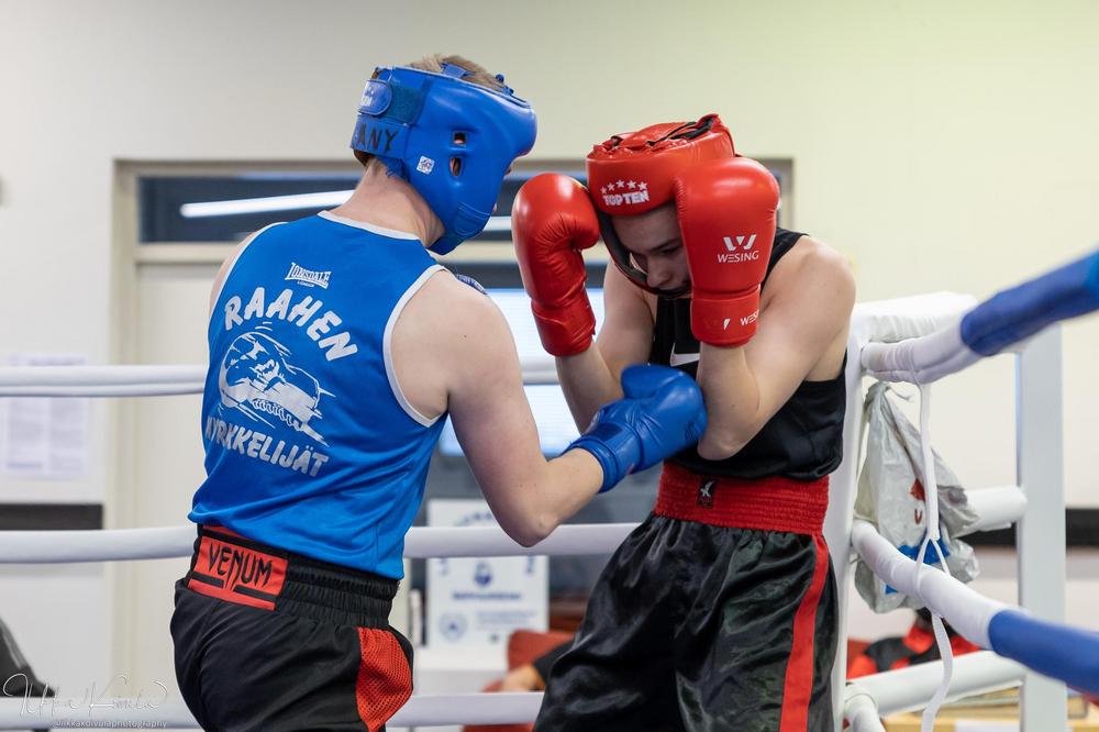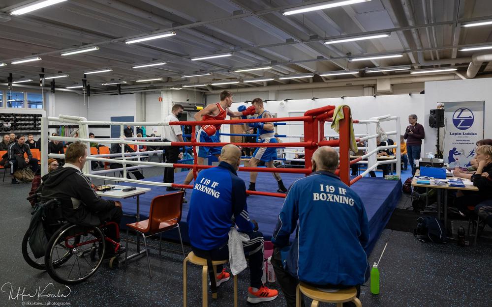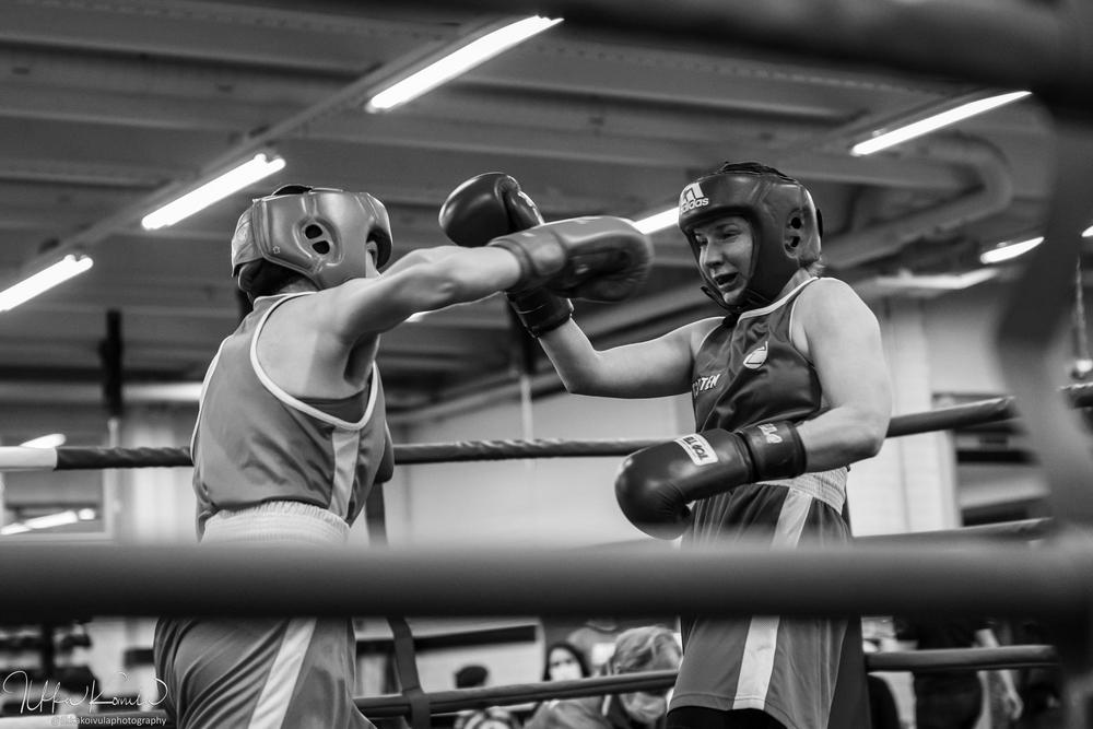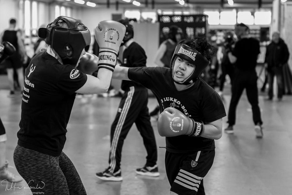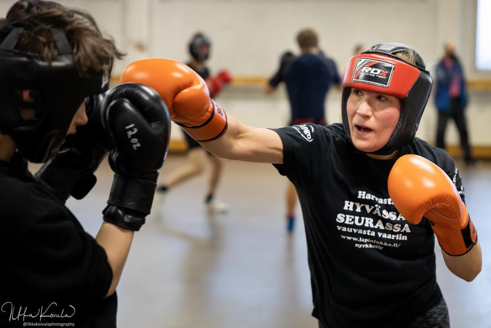 Mira Kiviharju otteli ensimmäistä kertaa kotikehässä Lapin Lukon väreissä Rovaniemen salikisoissa ja otti makean voiton uran toiseksi viimeisissä nyrkkeilykilpailuissaan. LaLu:n kemiläisvahvistus päättää uransa Helsingin SM-kisoissa joulukuussa. Kuva: Ilkka Koivula.